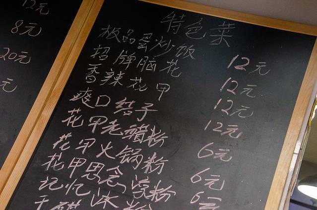 店里的菜单是用粉笔写在门口的小黑板上的,菜单比较简单,菜品不多,通常敢这样做的肯定都是有特色的店,极品蛋炒饭,招牌脑花,香辣花甲道道都有名,通通都是12元一份,串串五毛钱一根,可谓真正的好吃不贵。
