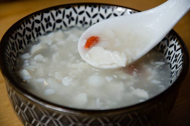 醉豆花,也就是醪糟味的豆花,加了枸杞,解辣的同时又不会很甜。