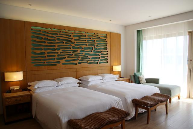 海棠湾 喜来登度假酒店的客房,不仅宽敞舒适,还配备有私人阳台。值得一提的是喜来登的床哦,可以说是小旅兔住过的酒店中最舒适的了。松软低敏感性的枕头,柔软的羽绒被,独特的床垫,让小旅兔睡得美美的。查了资料才知道,原来这里配备的是喜来登独有的弹性极佳的床垫——“甜梦之床”。非常赞~