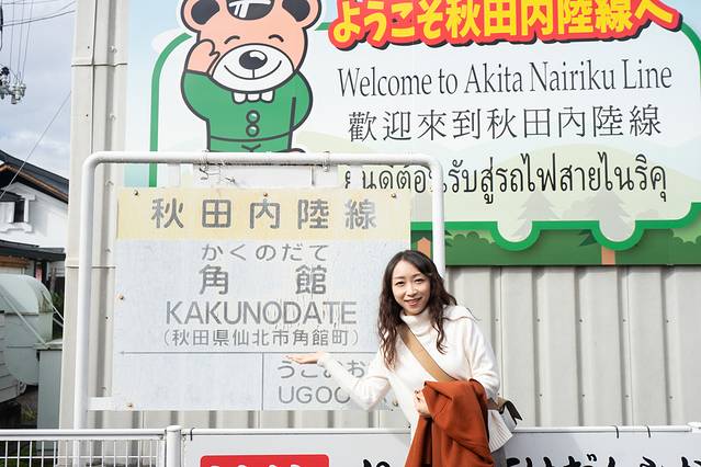 这辆内陆观光小火车,从角馆站一路开向大馆。可以在站内领一张宣传单,沿途标好了秋田犬的寻觅地址,在哪个站下车能找到哪一只秋田犬,包括最佳拍照点。