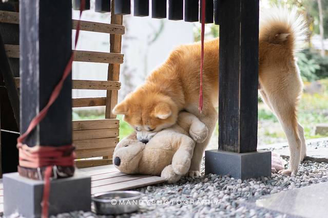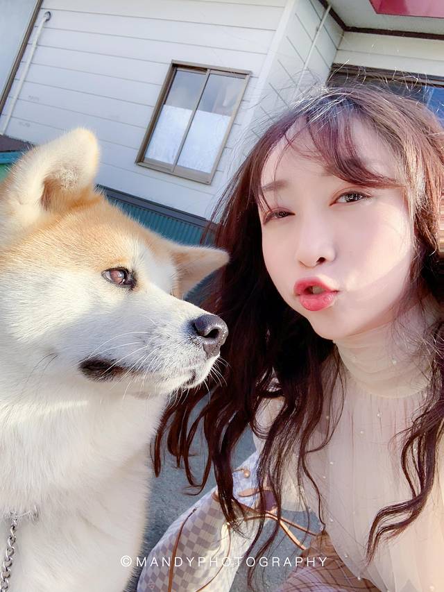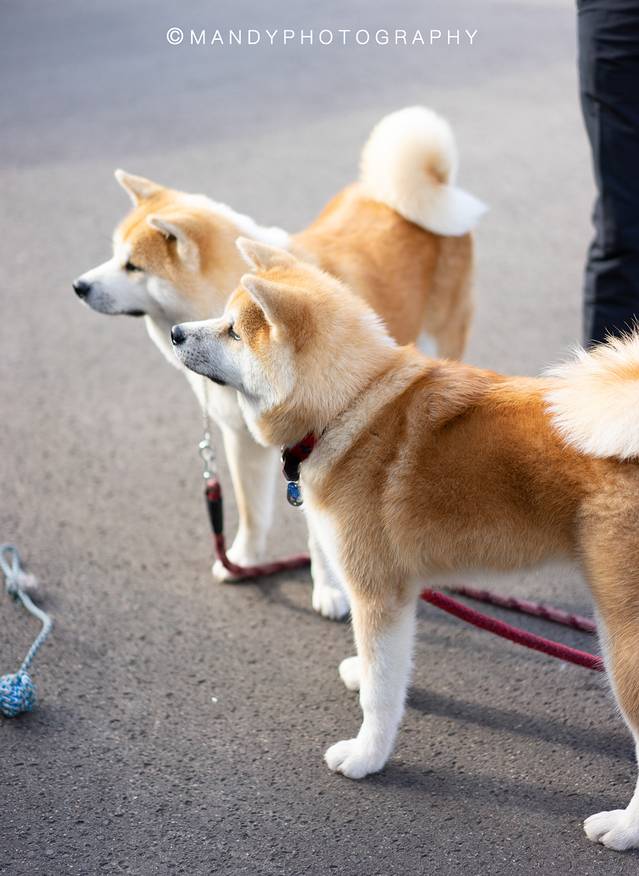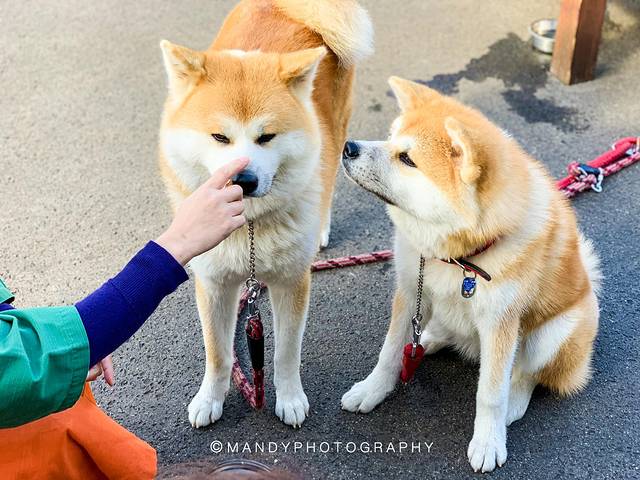 同样是秋田犬,母女Hana和Haru就显得见过世面很多,见了人就看着镜头拍照,拍完就自顾自地玩,偶尔抢抢主人手上的零食。