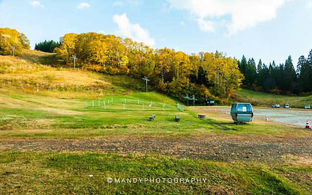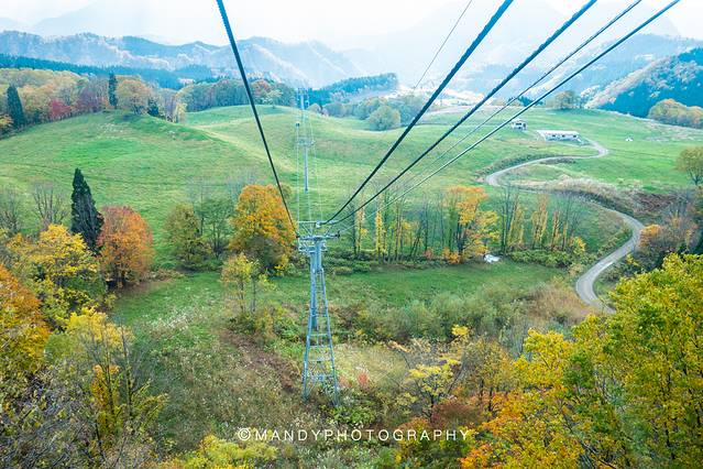 我们这次来就只是看红叶了。看到山脚的这个缆车车厢就知道,这里可以坐索道上山。这个月份,绿色是地上的草,红色是树梢上的叶尖,黄色是山间的林。一路向上,颜色越来越丰富,整片山的景色一览无遗。