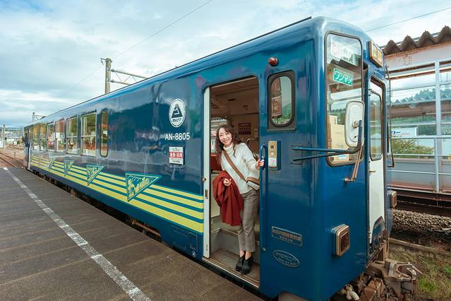 内部装饰是秋田犬主题的小火车,一直沿着铁路在山谷里穿梭,时而穿过两边都是绿叶的树林,时而开到红枫占主要颜色的山谷,火车开到最美的地方还会突然慢速下来,就像突然被1/10倍速放慢画面,所有乘客都不自觉拿起手机相机,被眼前的美景彻底征服。
