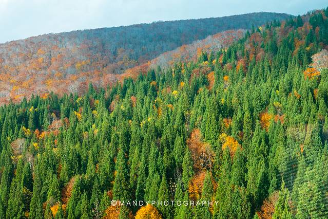 今年 日本 的红叶普遍红得比较晚,但秋田因为今年遭到盐分过重的台风侵袭,山上的叶子已经开始枯落。