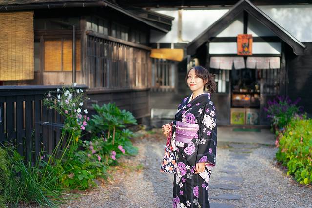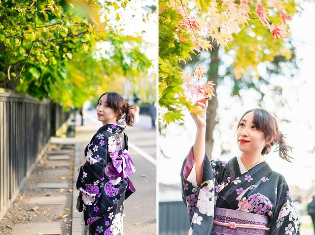 然而街道上只有我们一行人约了和服试穿,街上的欧美游客频频举起手机相机对准我们。想来好像每次来 日本 都会穿和服,无论是不是自愿。这次挑了一件和以往风格完全不一样的,深黑底色衬上紫色花瓣,相比显年轻显气色的粉色红色,这套颜色给了我一个不一样的角色:妈妈桑。好的知道了,下次我还是选浅色吧。