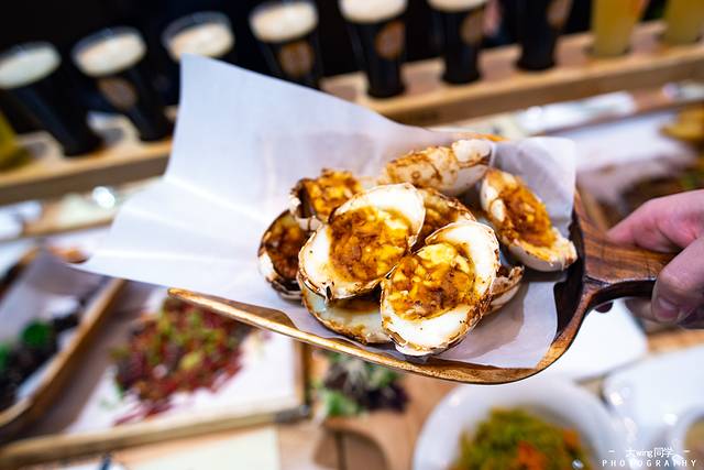 进了这扇大门,没什么事情比喝酒更重要了。室内暖气充足,我们连忙脱下沉重的外套,就像回到夏天一般,东北干燥的天气特别让人感觉口渴,或许只有大口的喝才能化解这样的纳闷感。二话不说,“同舟共济”立刻呈上餐桌,这是由黑、白、黄三款精酿啤酒组合而成。对于不懂内行的人来说,辨别这三款啤酒最简单的方法就是看颜色,但只要你不是“一杯倒”人士,你便会在细细品味中分辨出各自的味道,黑啤丰满的口感,黄啤入口绵润,白啤清爽甘甜,大多数女生都喜欢白啤,而我更倾向于最平凡不过的黄啤。啤酒不易上头,而久里的出品更充满了诚意,给人一种“再来一杯”的欲望。