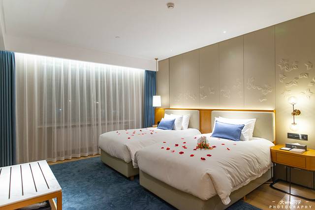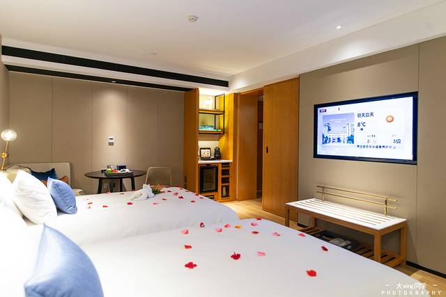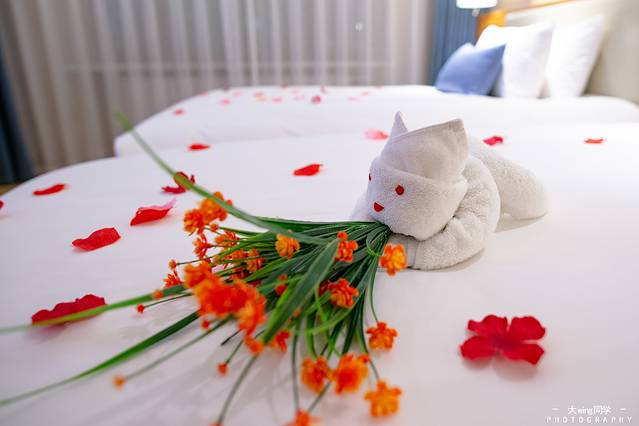 推开房门的那瞬间,心都被融化了,床上铺满了花瓣,还有造型可爱的浴巾,酒店真懂我们的少女心。每间客房都配有国际一流睡眠专家慕思床垫,雅高床品,墙壁上挂着55寸三星液晶电视,雀巢胶囊咖啡机可自由冲调自己喜欢的咖啡。