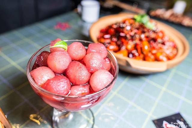 蓝莓冬瓜,最具创意的一款冷盘,一颗颗圆形的冬瓜被染成橘红色,没品尝之前我还以为是西瓜,咬一口之后才发现是用蓝莓汁冰镇过的冬瓜。