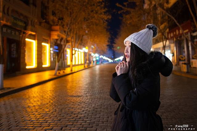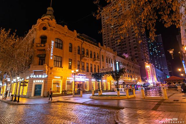 老洋楼散发着夺目的灯光,光滑的地面也被映射得辉煌,或许这个时候大伙们都该在室内吹着暖气,而我们却在大街上享受着寒风里的宁静。