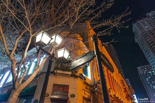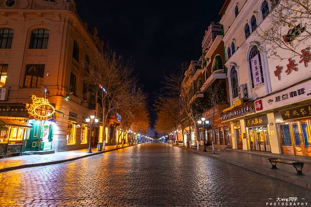 午夜的中央大街,与白天的繁华形成了鲜明的对比,两旁光秃的大树,泛黄的街灯,打烊的店铺,令这条空旷的大街略显萧条。