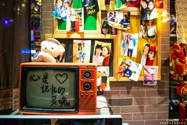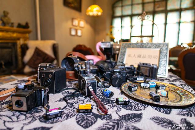 据说店主是一位摄影爱好者,所以台面上铺满了古老的摄影器材,零散的台面上散发着古老的气息。
