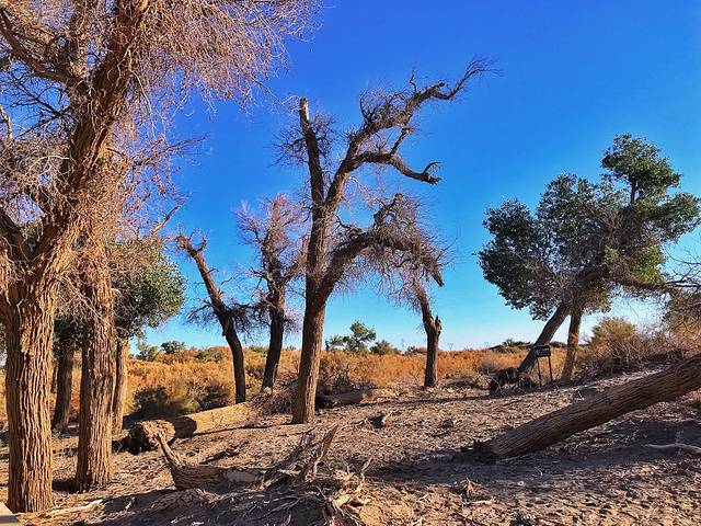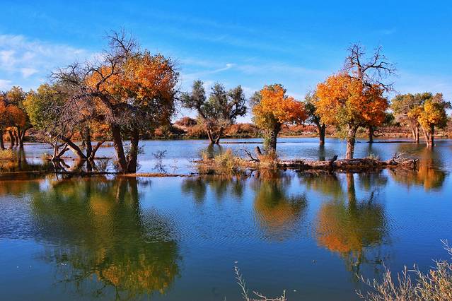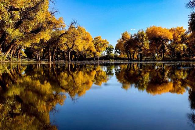绝对是我最爱的景点,没有之一!完全没办法把视线从水境胡杨中移开,蔚蓝的天空、金色的胡杨与清澈的湖水完美融合,似幻如真,甚至一时间根本分不清哪里是天空,哪里是倒影,留下的只有这一刻藏在心里的震撼与感动。