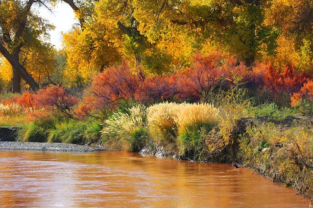 这里有着千亩红柳,绽放遍地,默默地和胡杨相依相守。置身红柳湾中,就像是置身于红花烈焰,饱满的色彩映衬了满眼娇艳的红,与胡杨的金黄片片自成一副天然的美景。登高纵览,红云舞动,似锦如霞,蔚为壮观。