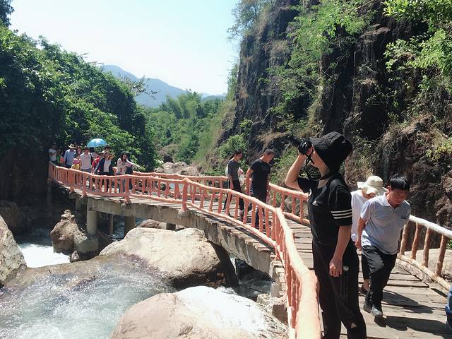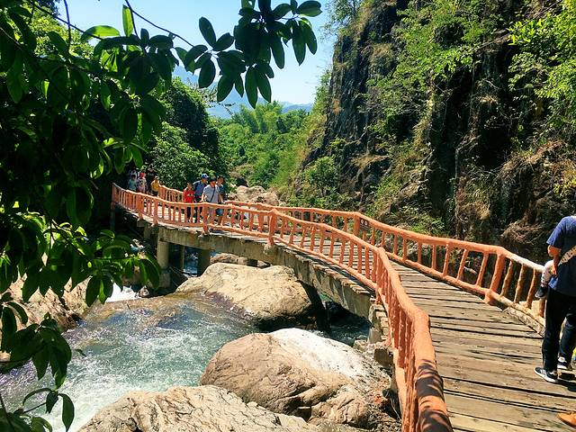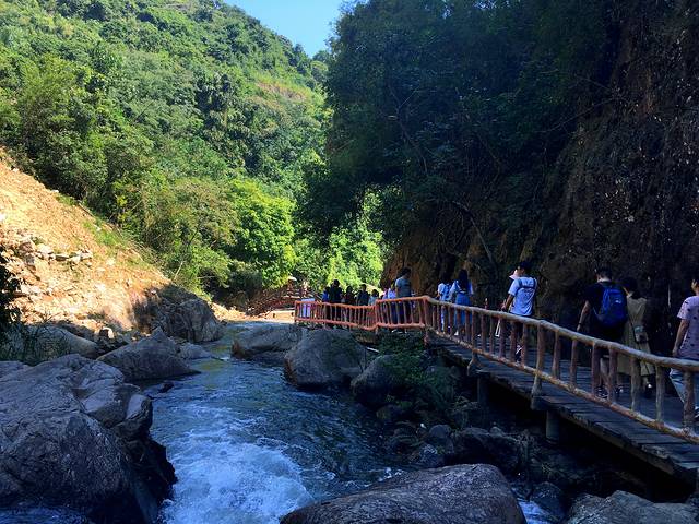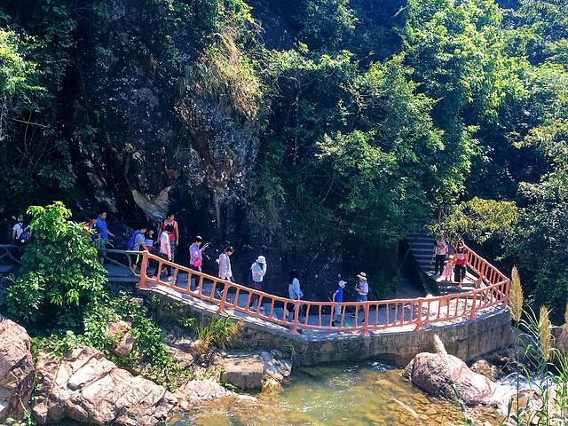 在全长2公里的亲水栈道上,一路顺着山谷,贴着溪流,迎着瀑布,沿途景色优美、空气清新,石现奇观。沾着山林峡谷之灵气,整个人的心情也愉快。站在栈道上望着远处的瀑布,就感觉很奇妙,同时也对它充满好奇。瀑布越来越近,瀑布声越来越明显。