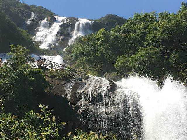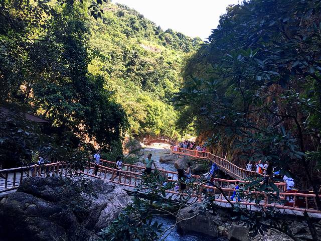 我们沿着海船木栈道游玩,一直看着远处的瀑布,超激动。因为这木栈道走起来很舒服,丝毫没有感觉我们在爬山,而且一路游山玩水的样子。漫步其中,可以一边观瀑戏水,一边呼吸清新空气,特别是站在栈道上看着四周,心情很舒畅。