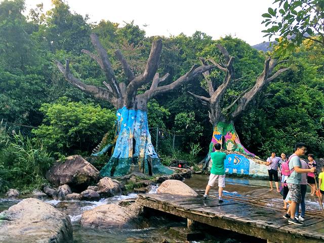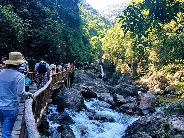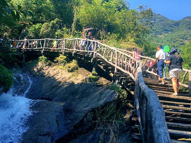 话说,白水寨被誉为“北回归线上的瑰丽“翡翠”,山高林密,空气清新,充沛的降雨量造就了以落差428.5米的中国 内地落差最大瀑布。而且有全国唯一用海船木建造的亲水栈道以及 广东 最长的登山步道“天南第一梯”。上山的路,有两条路线,一条是通过海船木栈道一路游玩上山,一条是直接爬台阶上山。当然了,我们选择最美的路线:一边游玩海船木栈道一边看瀑布。