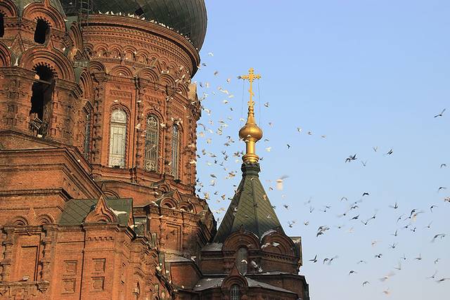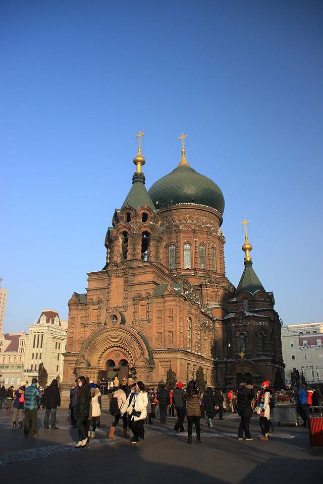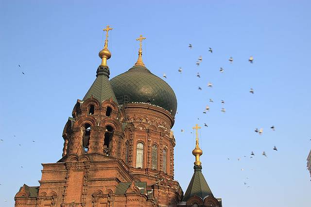 返程势必要经过哈尔滨的,从雪乡回到哈尔滨,第一站就去了圣索菲亚大教堂,正好好多鸽子飞起来,抓紧拍了照片,这简直太给力了。回家后给我们家小朋友看:“姑姑,这是大海鸥吗,怎么还飞到教堂上了”。