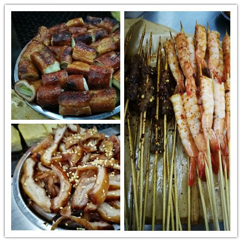 右边的烤牛肉和烤虾是“火一把”打包来的。其他都是老周烧烤。那个肠包葱还挺特别。