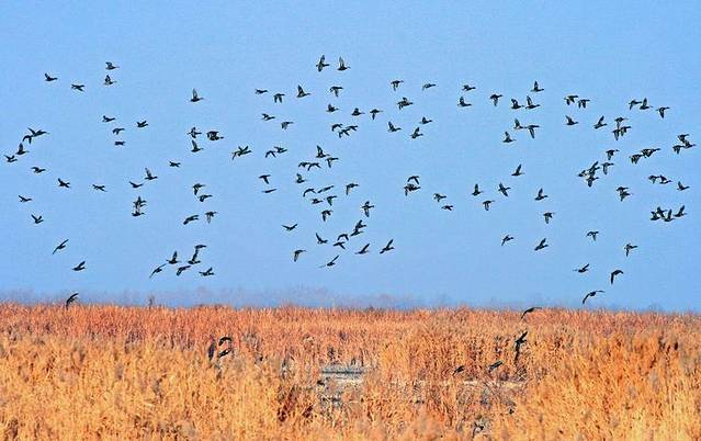 秋季,鸿雁南飞的季节,秋水凝重,芦苇金黄,飞雁惊鸿。