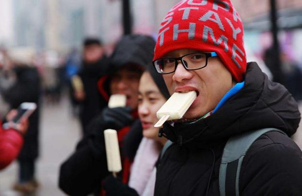 偷拍的,被发现了,因为太冷了我们不敢吃,不过中央大街上都是吃个冰棒的战士,答应了娃娃,等回到酒店的时候买一个给她,据说这个就是哈尔滨的特色优100年的冰棒了。