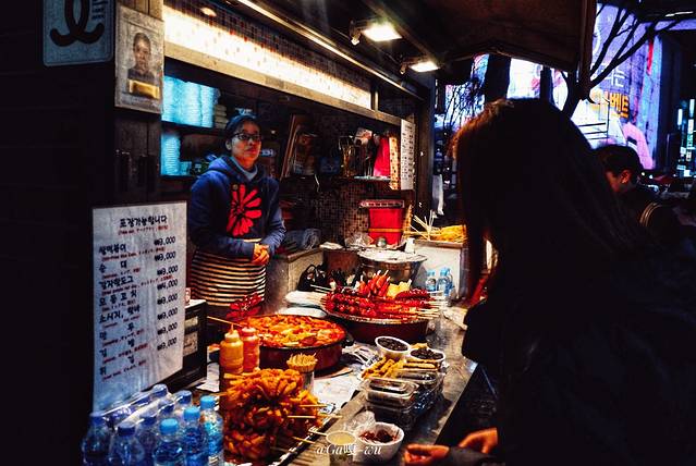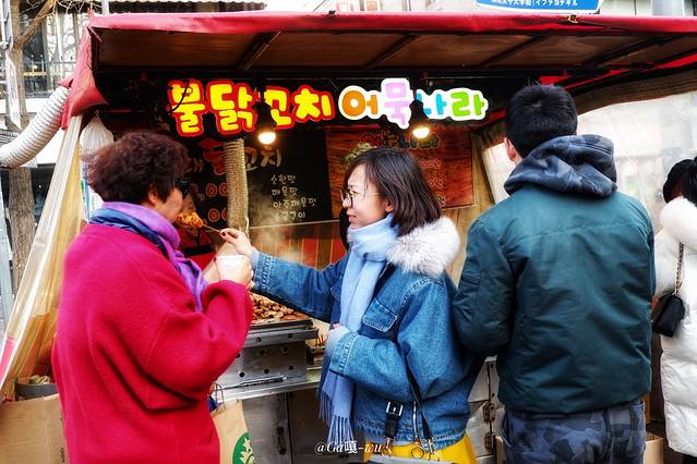 逛着逛着就天黑了,改变了去弘大的想法了!因为梨大附近也很多吃的!逛的!不得不感慨, 首尔 真的很人性化 走到哪都有小吃摊!不怕饿着