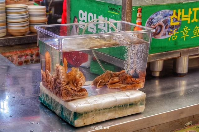 冒烟的炒年糕、石锅拌饭,各种拌面、冷面、饺子、紫菜包饭、辣泡菜猪肉、辣鸡脚、鱼肠、活章鱼!生牛肉!嗯呢! 请给我多几个胃.....