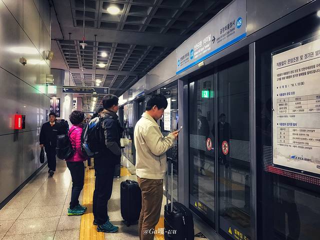 换成去 仁川 的地铁站超酷的,有8条线!全是韩文,对着那些圈圈杠杠一脸懵逼 只能问人了...幸好站着一个大姐看得懂我要去哪里..听到列车来的声音,她一个激动就帮我拉着行李箱飞奔到我要去的入口!感动!
