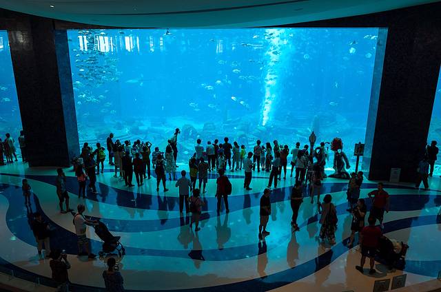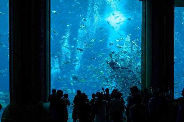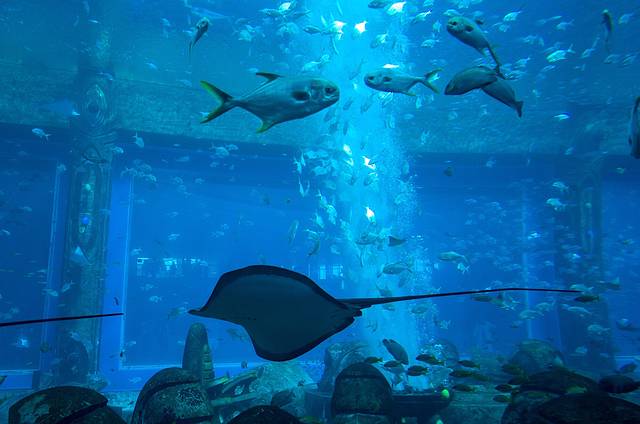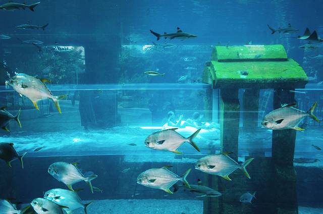 水族馆是一片水下展览馆,走进水族馆,仿佛走进了神秘而古老的亚特兰蒂斯古城,处处透漏古老而神秘的气息,亚特兰蒂斯的神化在这里得到了还原,里面是如迷宫一般的条条地下通道,每条通道都有着不同的海洋生物。