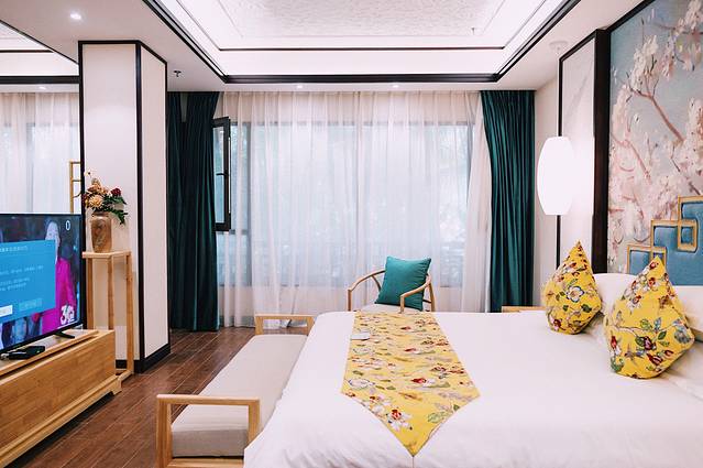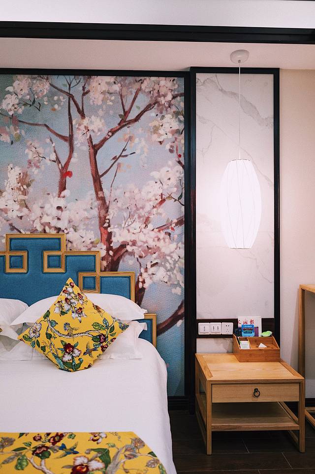 房间整体为现代文艺气息与古典装饰风格相互碰撞,壁画、灯饰、桌椅及床布,每一件物品仿佛都散发着一股迷人的味道,配色也十分讨人喜欢,黄色绣花的抱枕,海蓝色的床头,墨绿色的窗帘,一切的一切,让人顿感温馨静谧。
