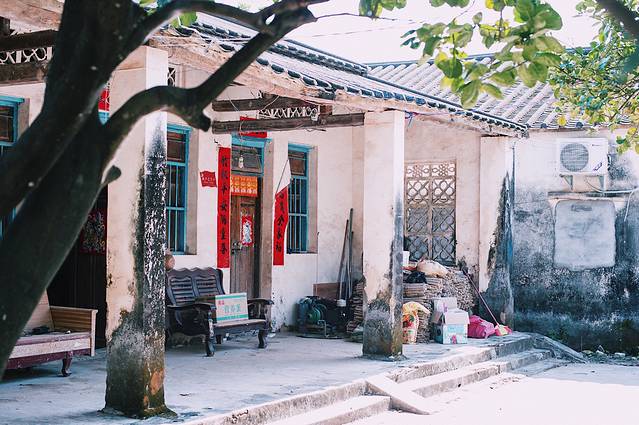 在这些古建筑群众保存最完好的是陈氏古宅,从房屋前也不难发现,建筑为一座两层四开建筑,这种建筑是我目前为止见过的造型最美的古建之一,门上设置有走廊,走廊上有飞檐,其造型工艺之精细堪称崖州神龛之最。