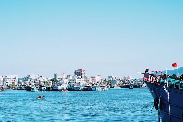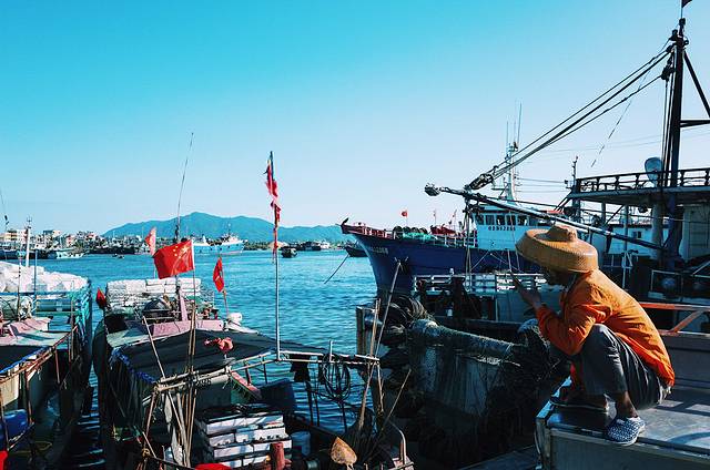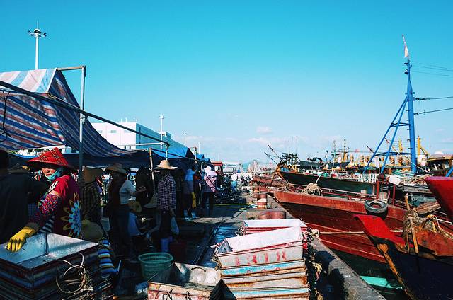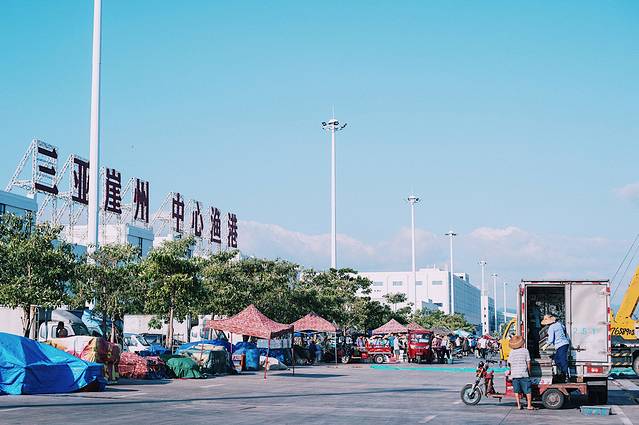 下午时分来到这里,4点以后也是这里最热闹的时候,还未到渔港时便有一股股鱼腥味扑面而来。在码头可以看到一艘艘渔船出海捕鱼归来,整整齐齐的停靠在码头边,自崖州中心渔港建成后,这里也成为了海南省南部地区最好的渔港之一,成为了过往船舶的停泊、避风、补给、卸渔交易的场所。