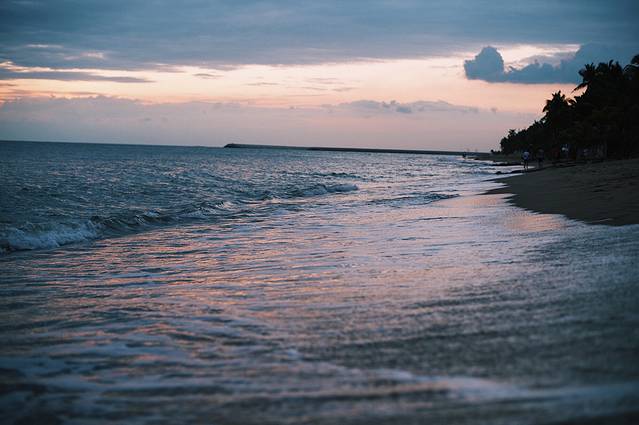 落日余晖下的海滩显得非常的幽谧,行人渐渐离去,除了海浪声基本上听不到其他的声音,继续沿着海滩往前走,可以看到三俩个迟迟不愿离去的钓鱼人。