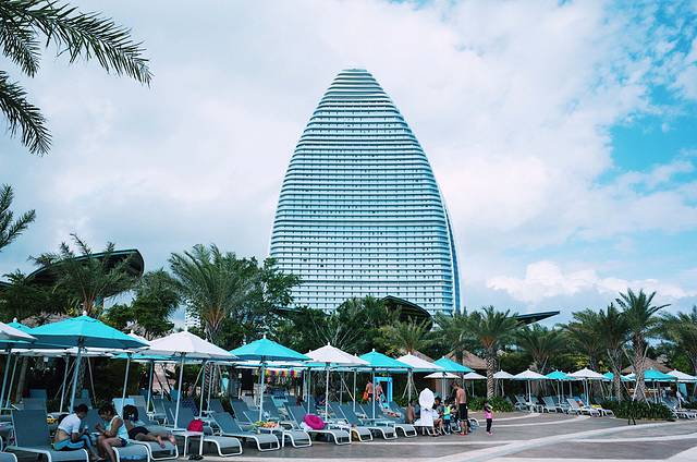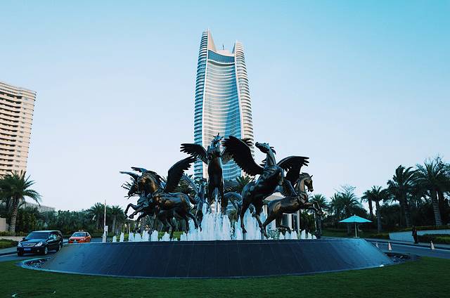入口处的雕塑成为许多人经过此处合影的地方,其后便是亚特兰蒂斯的主体建筑,设计灵感元素三亚当地元素,目测是海棠湾地区最高的建筑,楼顶据说还有停机坪。