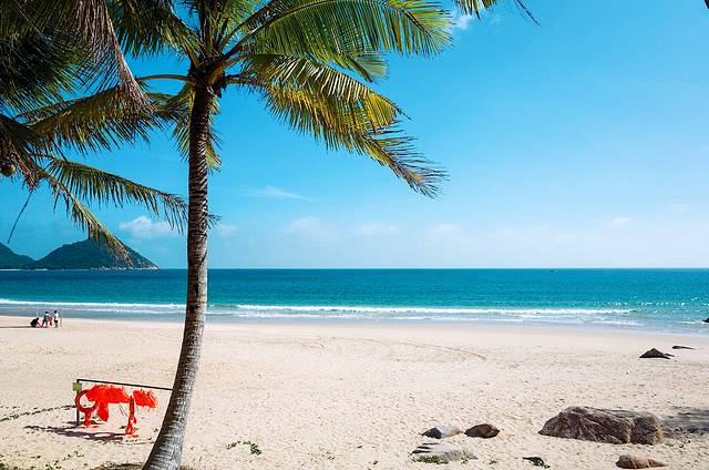 皇后湾位于海棠湾的南端,距离蜈支洲岛码头比较近,位置比较好找,乘车至蜈支洲岛码头大门处,然后一旁有一条柏油路直达皇后湾。来皇后湾的游人相对要少多了,加之海边的鱼排被拆除后,人更少了,仿佛如一片未被世人打扰的世外桃源一般,保持着原生态的模样。