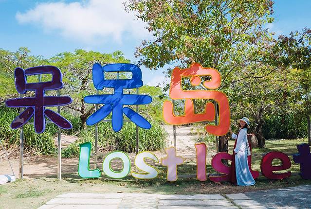 随着车辆沿着环海公路行驶15分钟的样子,便来到了呆呆岛,最先看到的是这三个大字,一旁会有工作人员介绍岛屿游览路线图,呆呆岛很小很小,右侧为情人崖,左侧为沙滩区域,建议先去右侧情人崖一览呆呆岛海岸风光,再去海滩戏水。