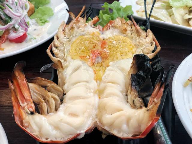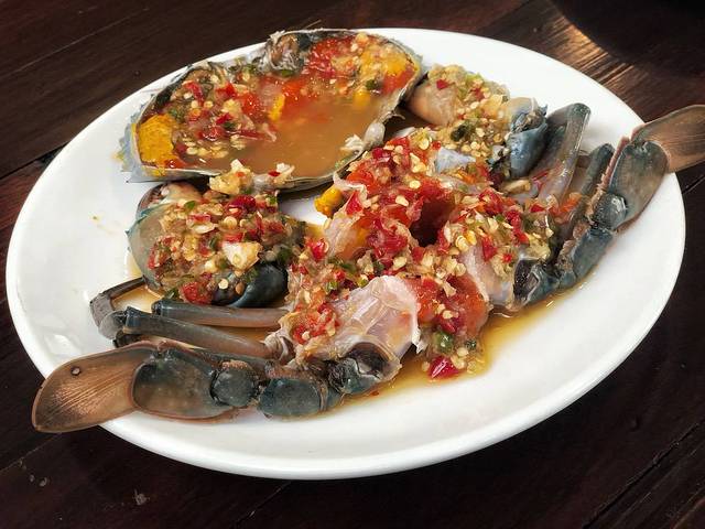 好啦到这次攻略的重点啦!!!话不多说上图!你没看错这真的是河虾哦,真的超大只的,而且味道真的很新鲜,浓郁的虾油配上特有的酱汁,小编尝了一口后有种《中华小当家》里面吃到美食后的感觉一样,真的超好吃的,价格方面有点小贵每只大虾600泰铢起,不过那么大只的新鲜河虾加上味道那么好吃,600泰铢还是值的!除了招牌烤河虾外还有泰国特色的泰式炒粉,还有用小河虾做的炸虾配沙拉,冬阴功炒饭等等,这些都是泰国比较道地的食物而且价格不是很贵100到200泰铢就可以搞定了。在这家店小编还吃到了一道以前从来没有在泰国吃过的菜——辣椒生蟹,朋友说这道菜是用生的螃蟹配上一些泰国特有的材料用泰国传统腌制方法腌制而成的,吃之前淋上泰国特有的辣椒酱,味道倍儿棒!这道菜看起来还挺有食欲的,口味有点特别,没试过的朋友可以趁着这次机会尝试一下。