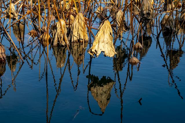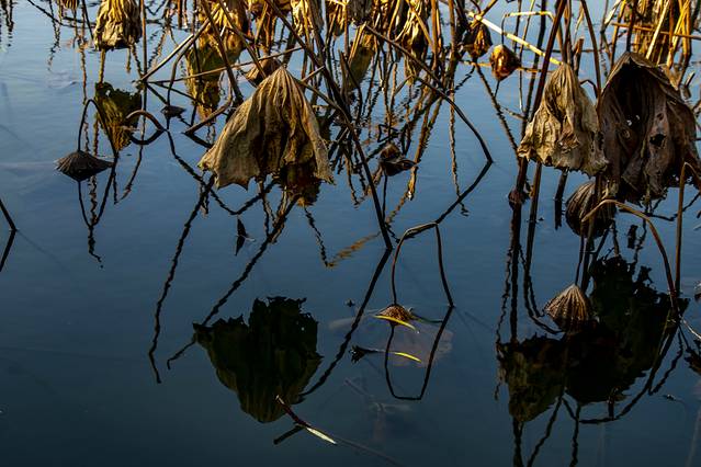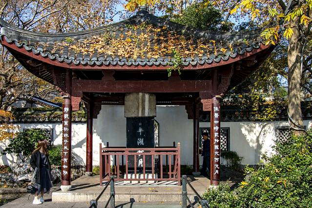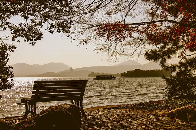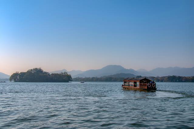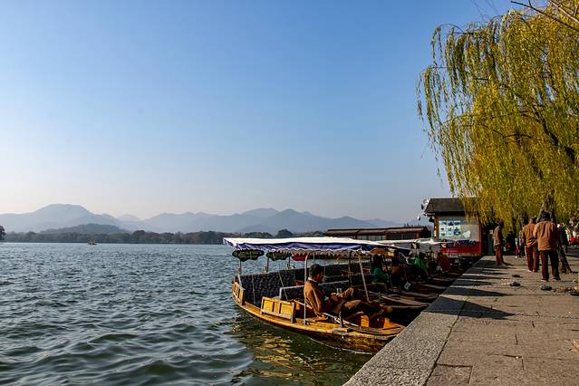 第二天用完早餐,便驱车前往平湖秋月。想起如今西湖边人挨看人的场景,本来是不打算去的,考虑到现在既不是旺季,还是工作日,侥幸着,就去了。天气虽已入冬,可湖边的杨柳却还泛着绿,正好天气又暖和,走在湖边,竟有种春意盎然的惬意。虽然,那残荷映在蓝色的湖水里,传递着淡淡的忧郁,但看那湖水,在暖阳的照射下波光粼粼,远处片片泛舟,不免让人忘却人生不快,浸沉在此景此情的感染之中。