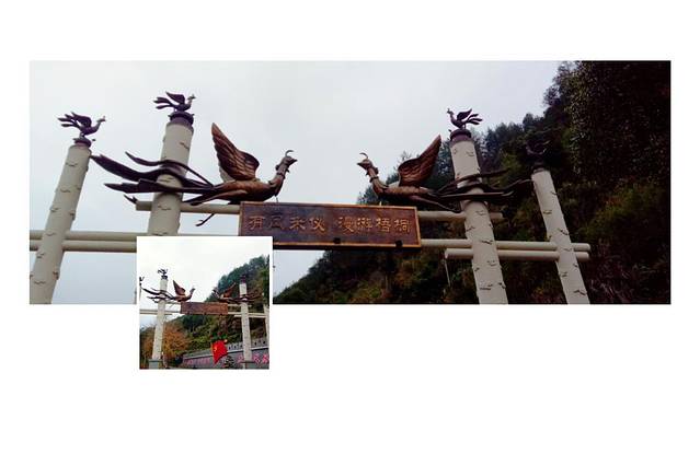 刚下车就看见四根汉白玉的柱子上雕刻着朵朵祥云,每根柱子顶端都栖着一只凤凰,还有两只大的凤凰栖在柱子中间的横杠上。这些凤凰都昂首挺胸,张开翅膀,尾巴有随风摆动之势。中间有一匾额“有凤来仪,漫游梧桐 ”