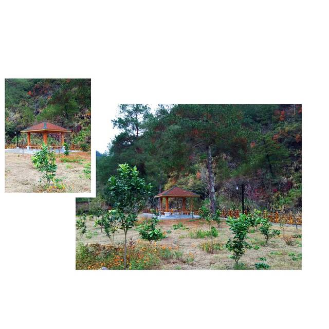 河岸边也修起了小花园,花园里面耸立着好几颗高大的马尾松,马尾松下是个小凉亭,凉亭外种着刚栽种下去不久的小柚子树,其中还有些硫磺菊点缀着,主要已到冬日,花园里原本的草本植物都似乎已经枯死。马尾松的枝头上也挂着枯黄的松针,至于树下早已经被枯黄的松针盖上了一层厚厚的被子。这些松针在以前,由于其特别容易被点燃,因此都会被勤劳的农民收集起来,用作冬季生火的起火“燃料”。