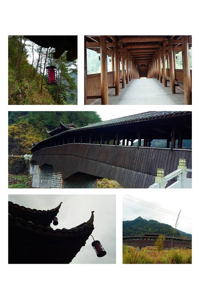 这座廊桥看着像是现在重新翻修过的,但是桥的整体除了底下由青石堆砌的桥墩外都是全木质结构的。踩在廊桥桥面的木板上还能听到轻微的像老式木质楼梯一样的那种“吱吱”声。廊桥的飞檐上也挂着跟栖凤亭同款的灯笼,在廊桥古朴的外表下,显得格外喜人。廊桥的桥面上,架着木长凳,要是夏天,这里一定是老人和小孩的避暑好去处。躺在长板凳上可以午憩,坐在长板凳上可以唠家常,这样的日子应该也是人生一大乐事了。