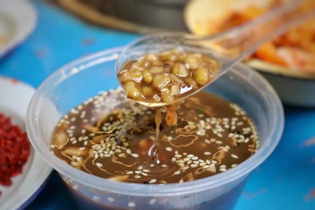 马路边边的绿豆汤里面的绿豆是从东北运过来的,熬的时候既要把它熬到扒软又不要熬烂,这样吃起来才有颗粒感,牙齿轻轻一咬,就可以感受绿豆在嘴里被压得沙沙的感觉