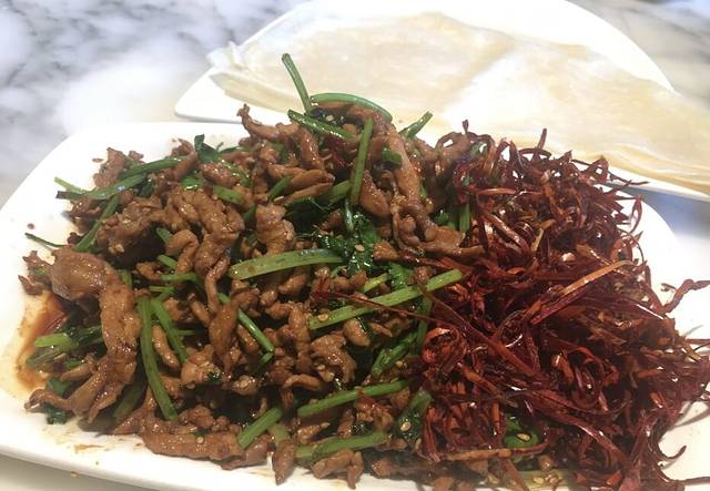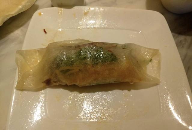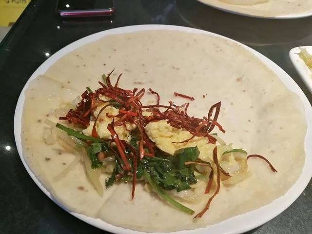 卷起来啦,这里的饼分春饼和筋饼,春饼稍厚点,筋饼稍微薄点,我个人认为还是筋饼更好吃一点。