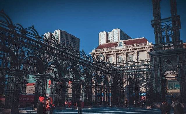 欧式的建筑,非常有浪漫的风情感觉,道路两旁有很多并条和雪雕,房子上边还有很多欧式的雕塑。