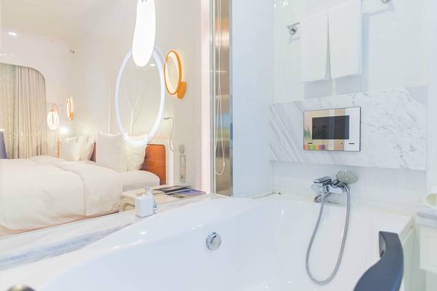 房间豪华舒适、简直就是至尊至贵的体验。房间里的各方面考虑的非常周到,就连小朋友的椅子也有准备到,房间里的洗手间就更加不用说了,洗手间非常的宽敞,有一个大浴缸和一个小浴室,你可以在这里泡上一个香喷喷的泡泡浴除去一天的劳累。在洗手间里酒店还很贴心给爱美的女士准备了电子秤,那就不怕吃太多东西控制不住自己啦!