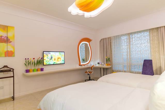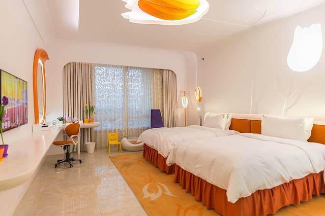 一走进郁金香主题房,你会发现它从上到下都是离不开郁金香的设计,不管是天花上的、还是床头的、背景的灯饰都是有着郁金香构造,而地板上的地毯、枕头一角上的绣花也都是郁金花的图案。