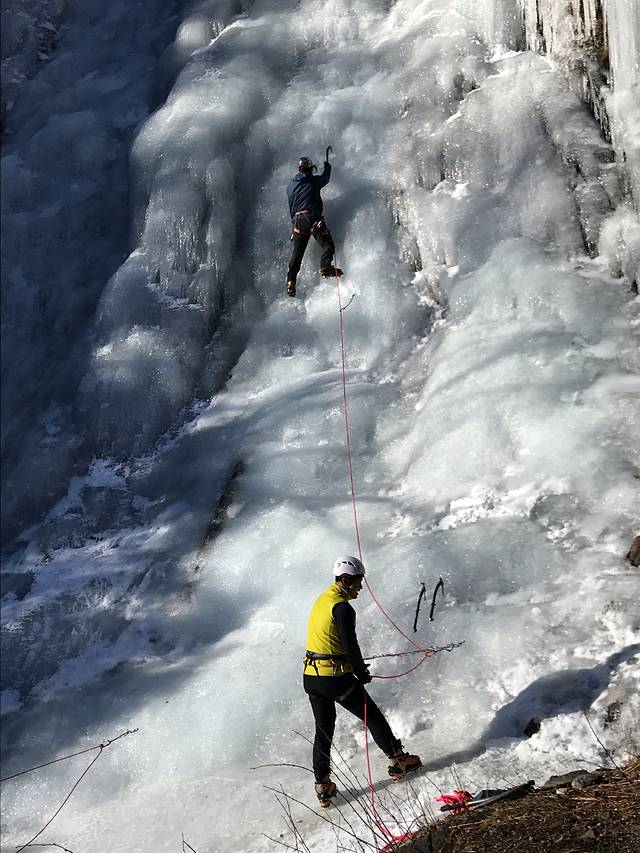 攀冰的过程,一人用冰镐攀冰而上;一人在下方用身体做保护