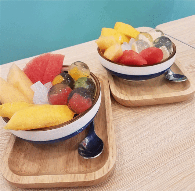 水果星球配芒汁粉,这道甜品虽说多是由水果组成,不过还真有点讲究,最底层放的是芒汁和凉粉,中层芒果、哈密瓜、西瓜和椰果,最上层才是晶莹剔透的啫哩球,球心还有果肉,真的超级好看。
