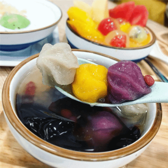 珍宝芋圆仙草(桂花汤)。这个据说制作特别精致,一共三个味道,分别是芋豆味、地瓜味和紫薯味,特别神奇的一道甜品。