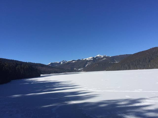 早上九点左右到底,由于淡季,人比较少。进了景区需要乘坐15分钟的大巴到达景点属都湖,然后可以选择徒步3.3公里或者是游船(由于是冬季,河面冰封,游船停止)