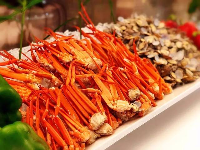 走到海鲜档口,一盆盆满满的海鲜放在眼前,雪蟹腿、深海白虾、梭子蟹应有尽有。软嫩的三文鱼刺身,任取任吃,大快朵颐,你唯一要头疼的就是一个盘子够不够拿。